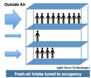 Occupancy sensors count occupants and regulate ventilation airflow accordingly.