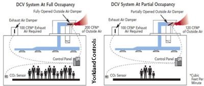 Demand-controlled ventilation (DCV) regulates the ventilation airflow rate using signals from air-pollutant sensors or occupancy sensors.